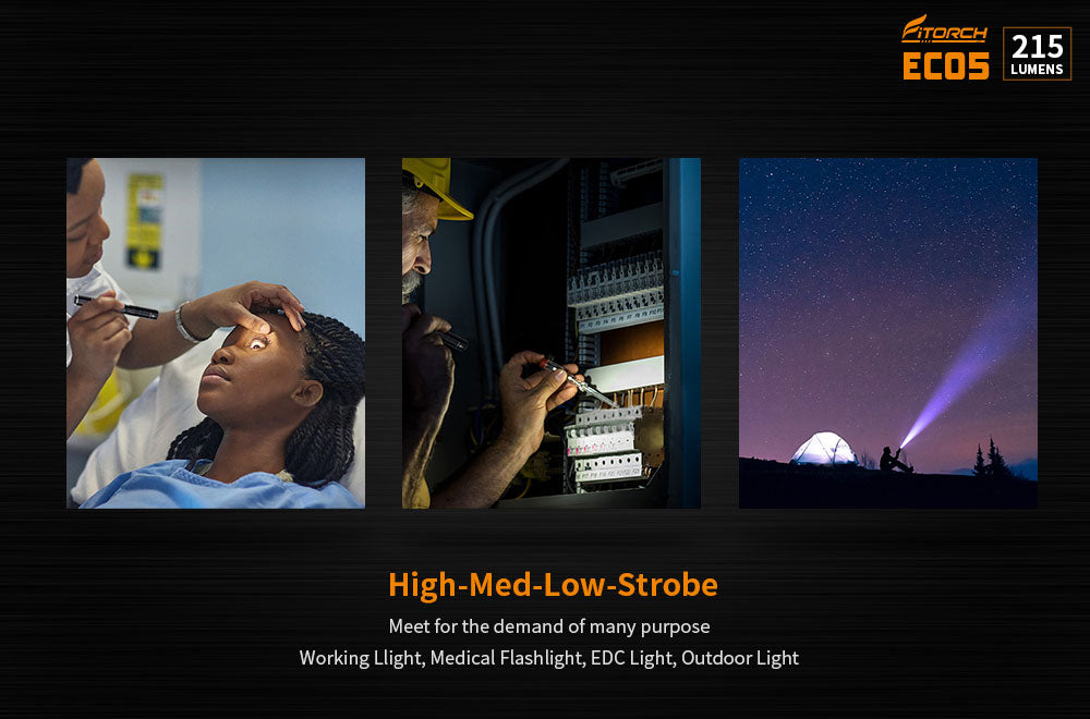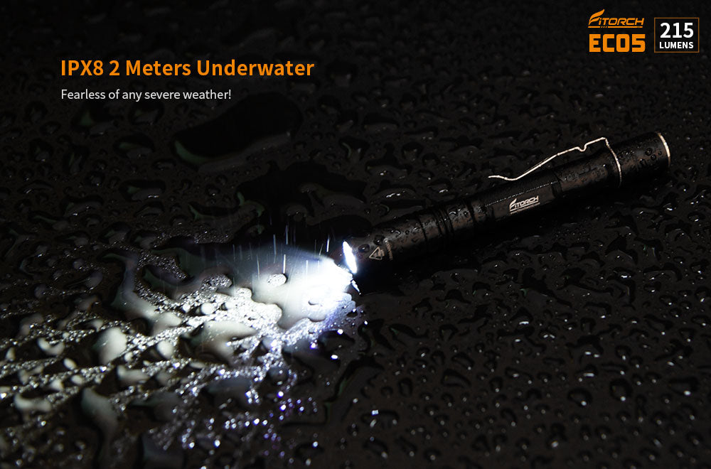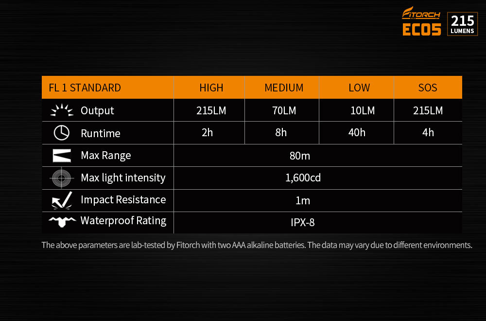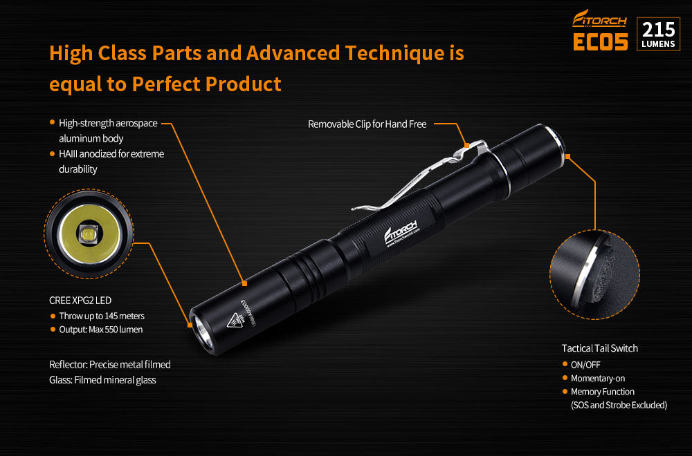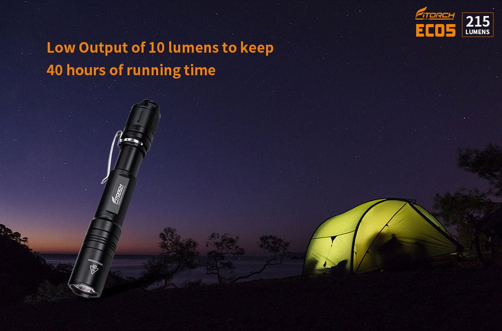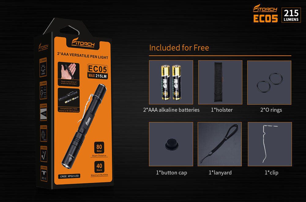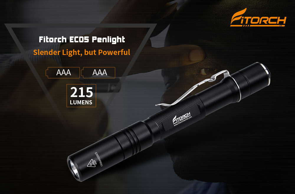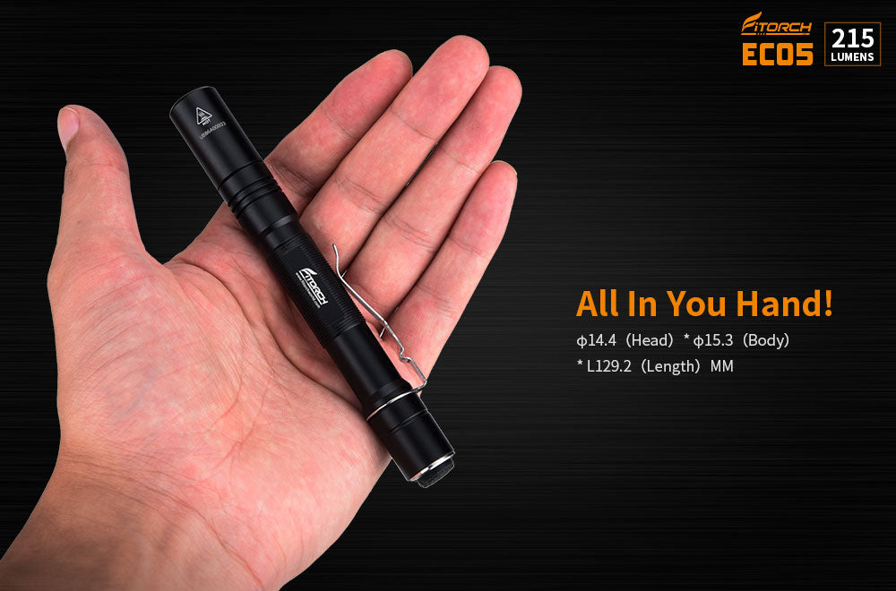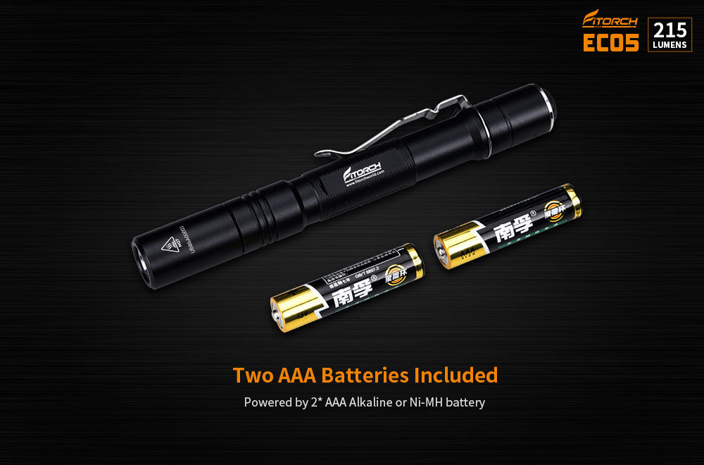 Linterna Fitorch EC05 Utiliza LED Cree XP-G2 con una vida útil de 50.000 horas. Utiliza 2 pilas AAA (Ni-MH, alcalinas) φ15,3 x L129,2 mm, 0,6 x 4,97 pulgadas (diámetro del cuerpo x longitud) Peso: 31,2 g (1,1 oz) sin batería Salida máxima de 215 lms, distancia del haz de 65...